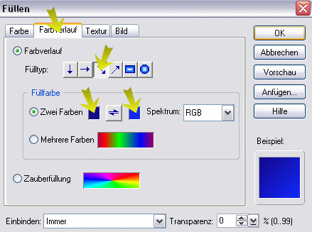 7. Danach klicken wir auf das Bild außerhalb der Blume und gehen auf Bearbeiten > Füllen. Dort können wir eine Farbe, Farbverlauf, Textur oder ein Bild als Hintergrund angeben. Ich habe einen Farbverlauf gewählt, der von links oben nach rechts unten geht. Als erste Farbe habe ich ein dunkles Blau genommen (#120788) und als zweite Farbe ein helleres Blau (#1129FF). Klicke auf OK.