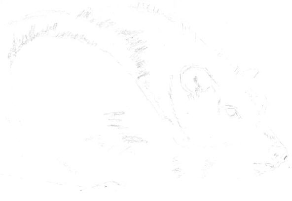 Lach, natürlich weiß ich, dass man hier nicht viel sieht. Die Skizze ist durchweg mit Bleistift HB entstanden, ohne auch nur einmal fest aufzudrücken. Dies ist das Stadium, in dem umgeformt werden kann, verbessert, verändert und radiert. Die erste Skizze muss stimmen, dann wird auch aus dem Bild etwas. Und wie gesagt, später soll und kann nicht mehr radiert werden. Die Skizze zeigt mir also, wo sich irgendwann etwas befinden wird. Sie ist mein Anhaltspunkt dafür, wo ich im Anschluss ausarbeiten werde. Viele Linien der Skizze werden im Laufe der Arbeit übermalt, dennoch sollte man nicht davon ausgehen, dass dies mit allen der Fall ist. So achte ich bereits bei der Skizze darauf, den Strich in die richtige Richtung zeigen zu lassen. Die Haare des Wolfes fallen bereits jetzt so, wie sie es auf dem Foto machen. Darauf zu achten erleichtert auch die folgende Ausarbeitung, denn so spärlich es jetzt aussieht, es ist meine erste Struktur, nach der ich mich richte. Also, diese steht jetzt und schon geht es weiter: