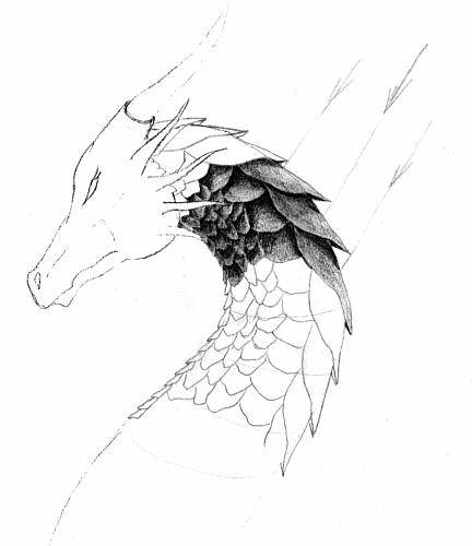In der Skizze habe ich verschiedene Schuppenformen und -größen kombiniert, damit das Ganze nicht zu gleichförmig wirkt. Die Linien und Pfeile verdeutlichen den Lichteinfall. Beachtet, wo die abstehenden Rückenplatten einen Schatten auf die darunterliegende Rückenplatte werfen.