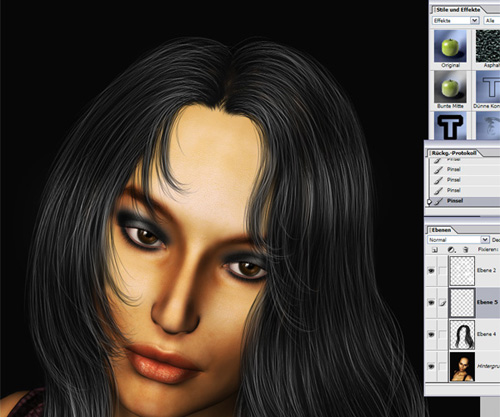 Schritt 8: Dann sollten auch die letzten Reste der blockigen Strähnen verschwinden, indem ihr feine, fließende Haare auftragt, die sich gegen die Konformität sträuben und ihren eigenen Weg einschlagen. Diese dürfen, nein, sie müssen sogar die Grundform der Haare durchbrechen. Haare legen sich nicht alle brav in die gleiche Richtung, sondern führen ein Eigenleben, eine Sache, die wir hier mit feinen 1 Pixel Strichen andeuten. Legt noch mehr Lichter auf, wenn ihr es für notwendig erachtet, malt ein paar einzelne Striche in das Gesicht, schaut euch die Haarspitzen an und malt noch mehr feine Strähnen hinein, bis sie gut aussehen und nichts mehr an eine blockige Grundform erinnert. An dieser Stelle kann ich euch nicht mehr viel erzählen – ihr müsst selbst ausprobieren, was euer Haar noch besser aussehen lassen wird und wie ihr diese Elemente am Besten anwendet. Vergesst am Ende aber keinesfalls, noch Schatten unter der Haarebene anzubringen, damit das Haar an Tiefe gewinnt – denn da wo das Haar ins das Gesicht fällt oder den Körper berührt, wird es auf der Haut oder auf Kleidern Schatten erzeugen.  |