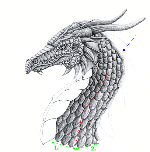 Ihr erinnert Euch an den Lichteinfall? Hier hab ich ihn nochmal mit dem blauen Pfeil eingezeichnet. Daraus folgt dass die Schuppen auf der einen Seite vom Hals (1.) im Schatten liegen während auf der anderen Seite das Licht auftrifft (2.).
