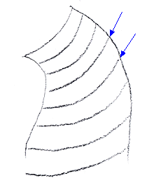 3c 2) Jetzt werden vertikale Linien in einem relativ steilen Winkel aufgezeichnet, natürlich auch ein wenig gewölbt (rote Pfeile).