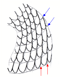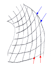 3c 2) Now you add some vertical lines in a steep Angle, these lines are curved too of course (red arrows).