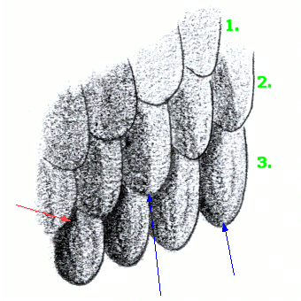 Dann verdunkelt man ausserdem noch die Schuppenseite die im Schatten liegt (2.), denn auch Schuppen sind nicht flach sondern gewölbt (blaue Pfeile).