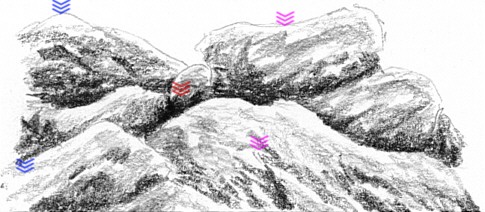 Dabei lasse ich wieder weiße Stellen frei, denn sie liegen im Licht (blaue Pfeile). Was mir bei einer Felsgruppe wie dieser wichtig ist, sind hin und wieder ein paar scharfe Kanten (rosa Pfeile). Bis hierhin hatte ich den tiefen Schatten vor dem kleinen Stein (roter Pfeil) vergessen. Mit ihm wirkt die Szene gleich viel plastischer. So, schon sind wir so gut wie am Ende. Natürlich könnte man ewig weiter zeichnen, doch irgendwann sollte man doch aufhören. Nur der hintere Felsen ist über dem kleinen Stein (in der Mitte) nicht fertig. Also bekommt er noch eine schattige Seite dazu.