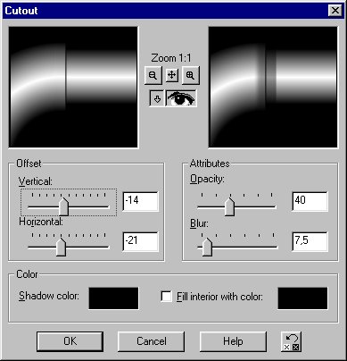 Beim Zusammenfügen muss lediglich darauf geachtet werden, dass die hellen Lichtlinien exakt anschließen. 6. Jetzt gibt es noch ein wenig Feinarbeit: die Muffen sehen noch ein wenig ... steril aus. Da gibt es ein paar einfache aber doch wirkungsvolle Effekte mit dem Cutout-Tool. Nachdem markiert ist, wird mit dem Befehl Cutout (Effects --> 3D-Effects --> Cutout) die Muffe bearbeitet. Dabei sind folgende Einstellungen sinnvoll: