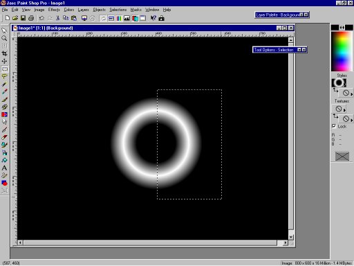 Grundsätzlich wird bei diesem interessanten Effekt die gleiche Technik benutzt, wie bei dem Metallbalken: 1. Erstellt eine neue Arbeitsfläche mit schwarzem Hintergrund. 2. Mit dem Tool "Selection" erstellt ihr einen Kreis mit ca. 150px Durchmesser.