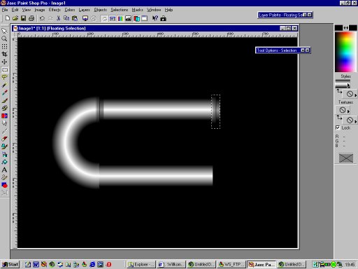 Als kleine Spielerei und weil die Selektion gerade da ist kopieren wir die gesamte Selektion so, wie sie ist (Strg-C) und fügen sie am Ende des Rohres mit Strg-E wieder ein. Auch hier darauf achten, dass die Lichtlinie nicht versetzt ist. Das gesamte Bild sollte nun so aussehen: