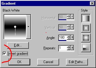 5. Um den Inneneffekt anzubringen, muss nun die Selektion verkleinert werden. Wählt aus dem Menü "Selections --> Modify --> Contract und gebt als Pixelwert 10 ein. 6. Die jetzige Selektion muss nun invers gefüllt werden. Dazu ruft ihr wieder die Farb-Styles auf und markiert das Kästchen "Invert gradient" und füllt die Selektion.